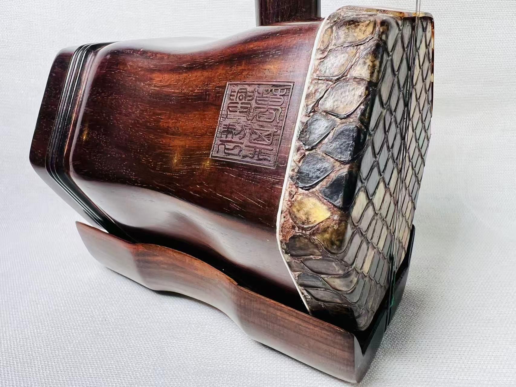 ミャンマーを中心とした東南アジア産ニシキヘビの一番良い皮の鱗の大きな部分を使用することによって出来上がった、長年二胡制作に携わってきた作者のこだわりを実感していただける二胡です。
